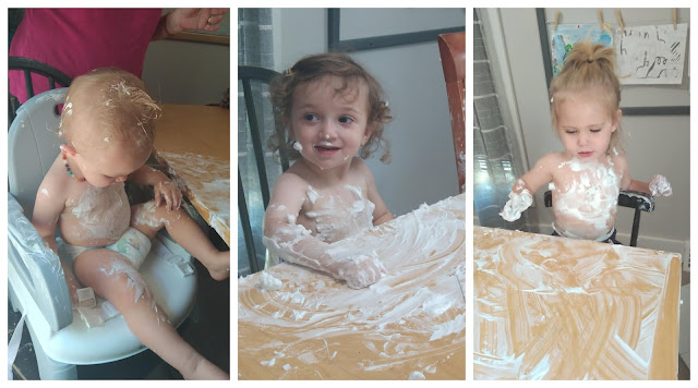 One late afternoon as we waited for parents to arrive, we set out some shaving cream for baby sensory play.